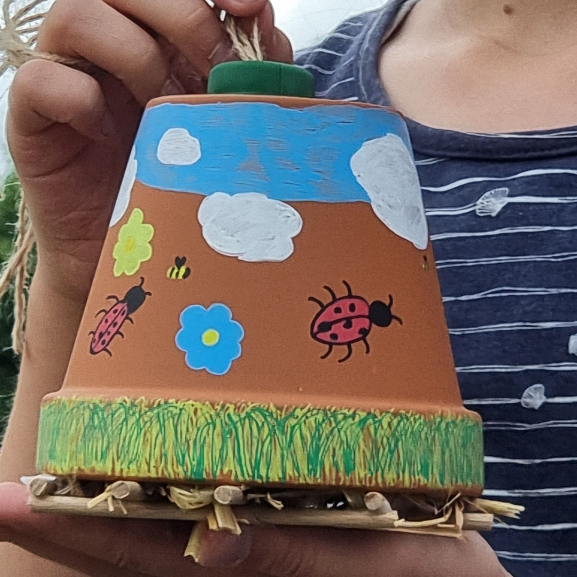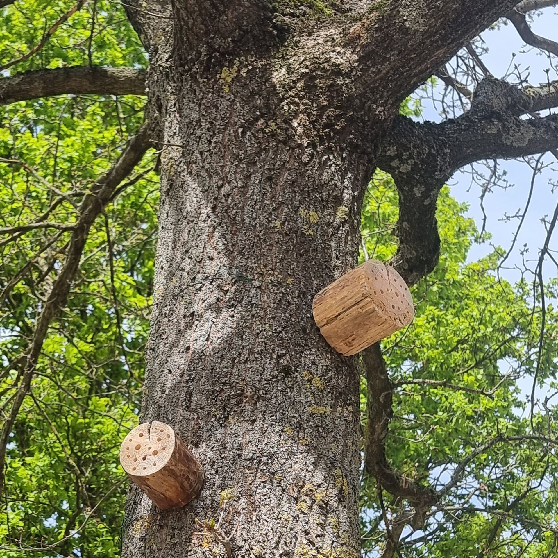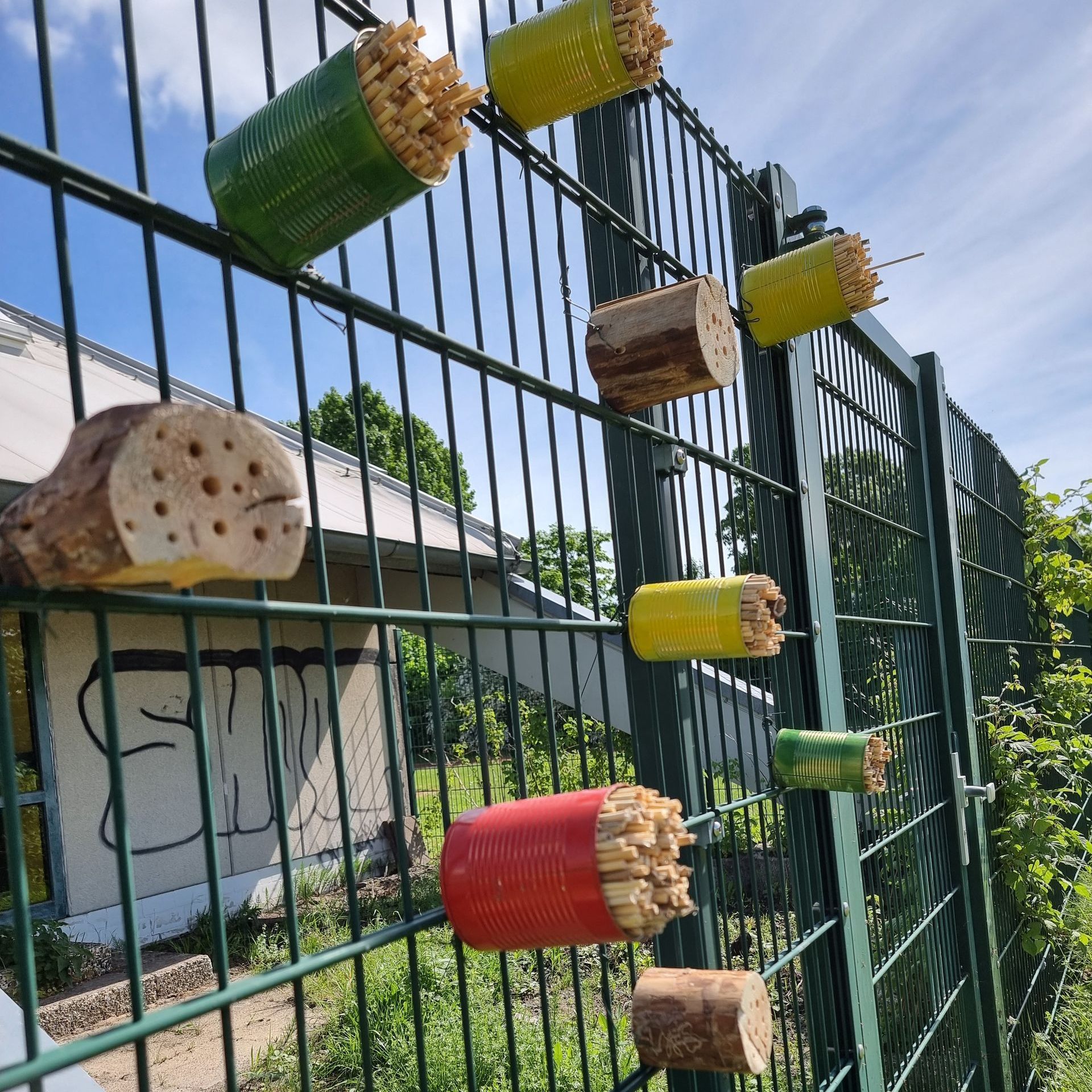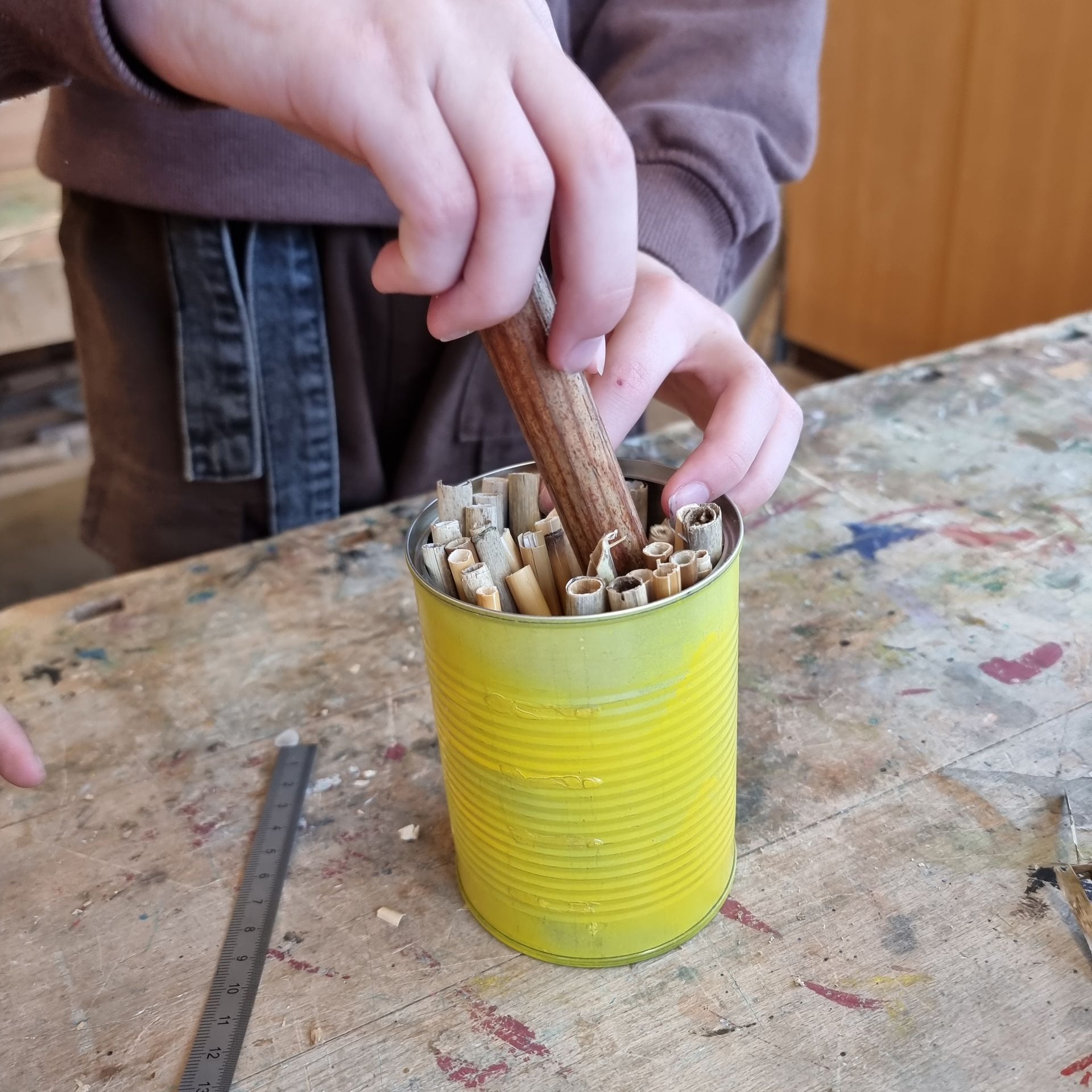 Zum Bestäuben aller Pflanzen benötigen wir Menschen die fleißige Hilfe der Wildbienen. Mehrere hundert verschiedene Arten gibt es bei uns. Sie leben als Einsiedlerbienen und versorgen ihren Nachwuchs in kleinen Höhlen, Löchern und Mauern- und Holzspalten. Viele Wildbienenarten sind leider selten geworden, da ihre Lebensräume fehlen oder zerstört wurden. Ohne Wildbienen kann es aber kein Obst und Gemüse geben. Daher haben wir geeignete Nisthilfen im Werkunterricht gebaut. Die Nisthilfen haben wir der Schule zum Abschied geschenkt, damit es im neuen Schulgarten unserer Grundschule so richtig summt und brummt.
