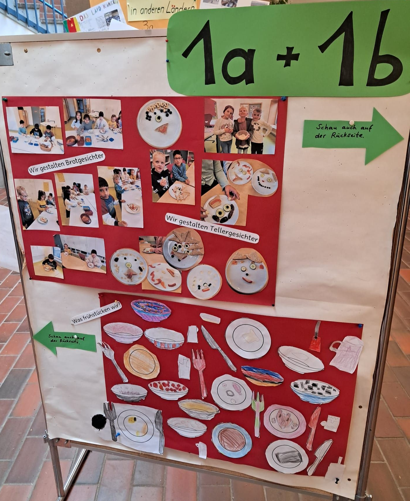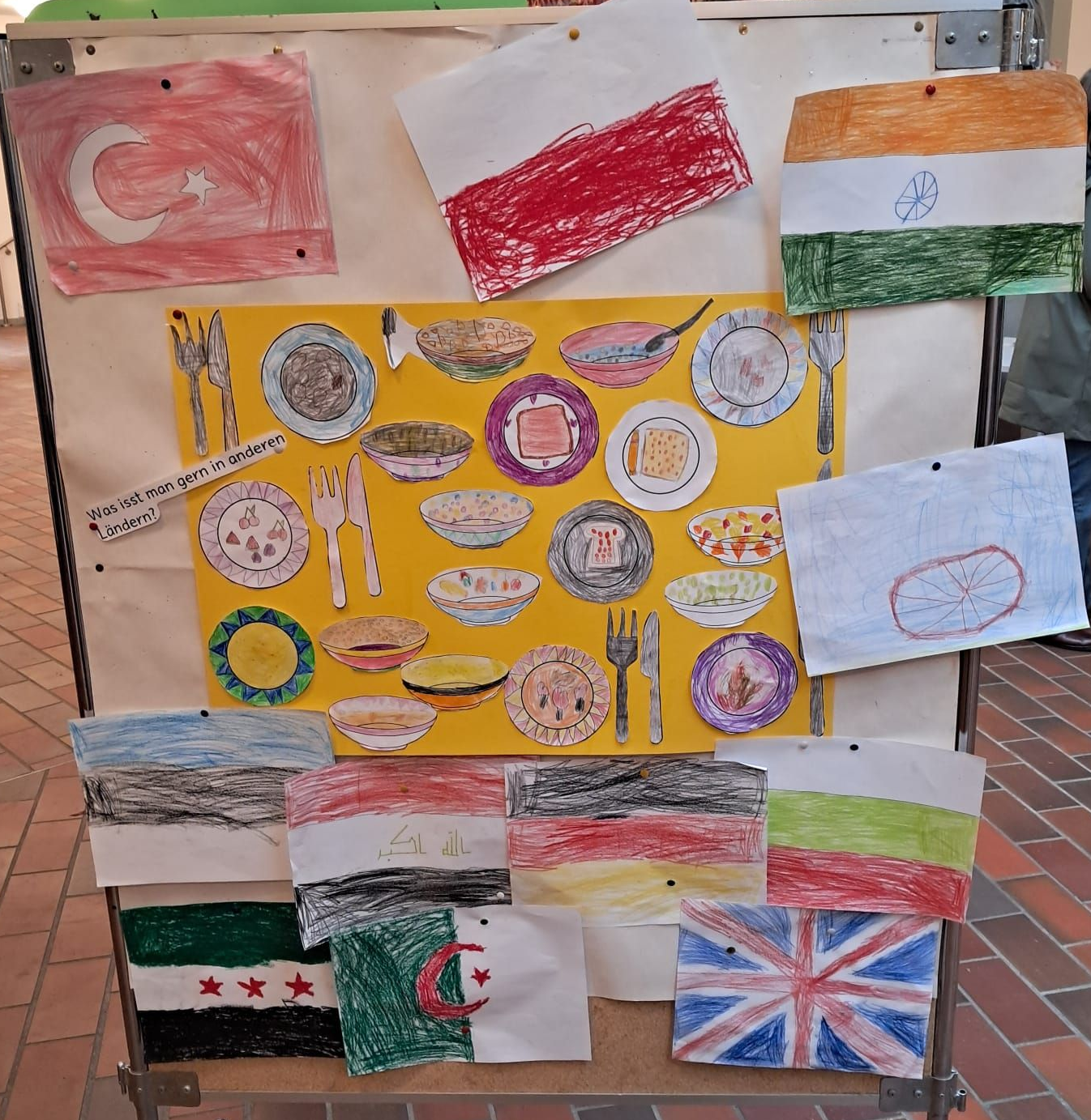 Die Kinder der ersten Klassen gestalteten lustige und leckere Brotgesichter. Außerdem sprachen sie darüber, woher ihre Familien kommen, und stellten typische Frühstücke aus ihren Herkunftsländern vor. Passend dazu bastelten sie bunte Flaggen, die zeigen, aus welchen Ländern ihre Familien stammen.