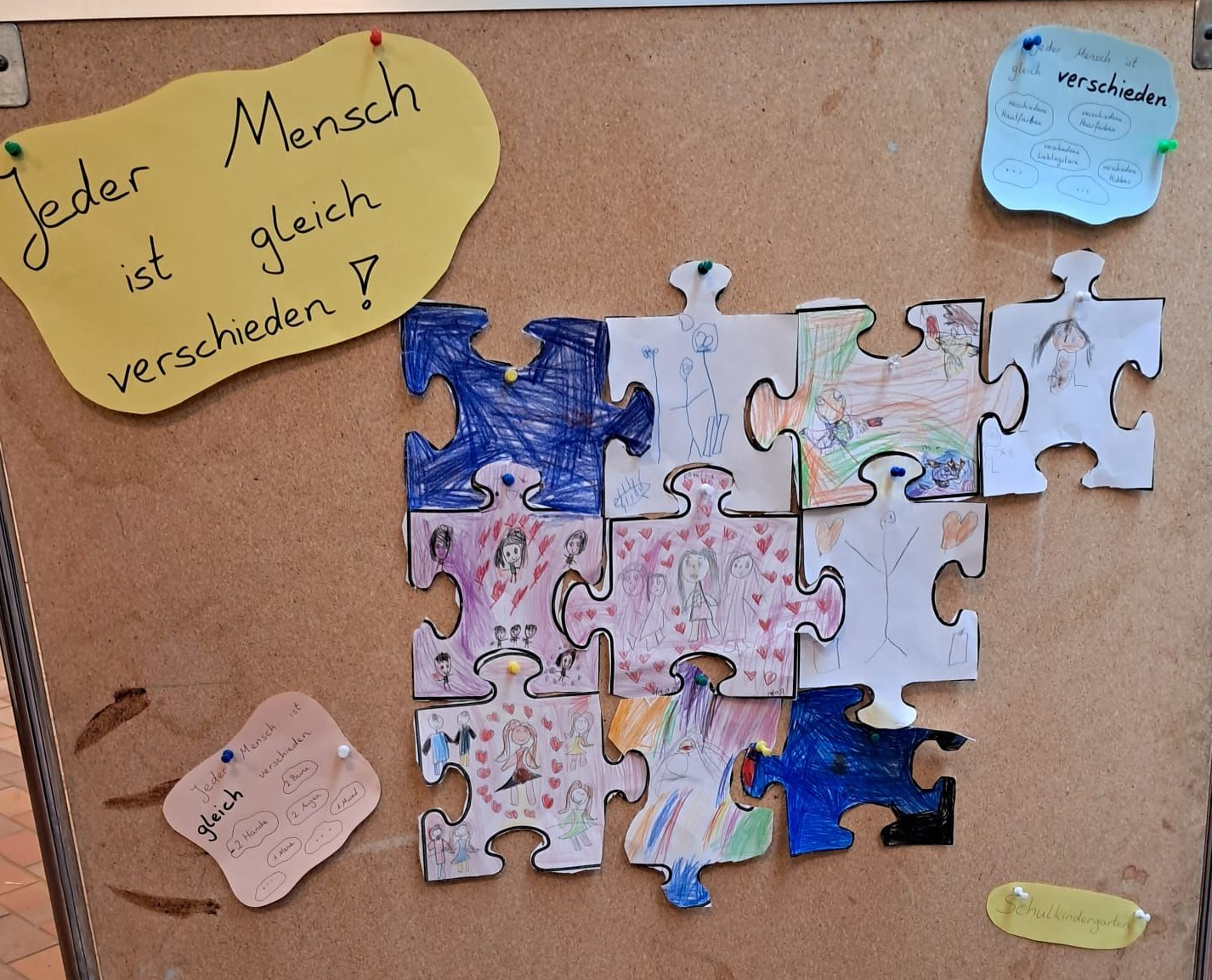 Die Kinder gestalteten bunte Puzzleteile, die zeigen, dass wir alle verschieden und doch miteinander verbunden sind – denn jeder ist einzigartig, aber wir haben auch viele Gemeinsamkeiten.