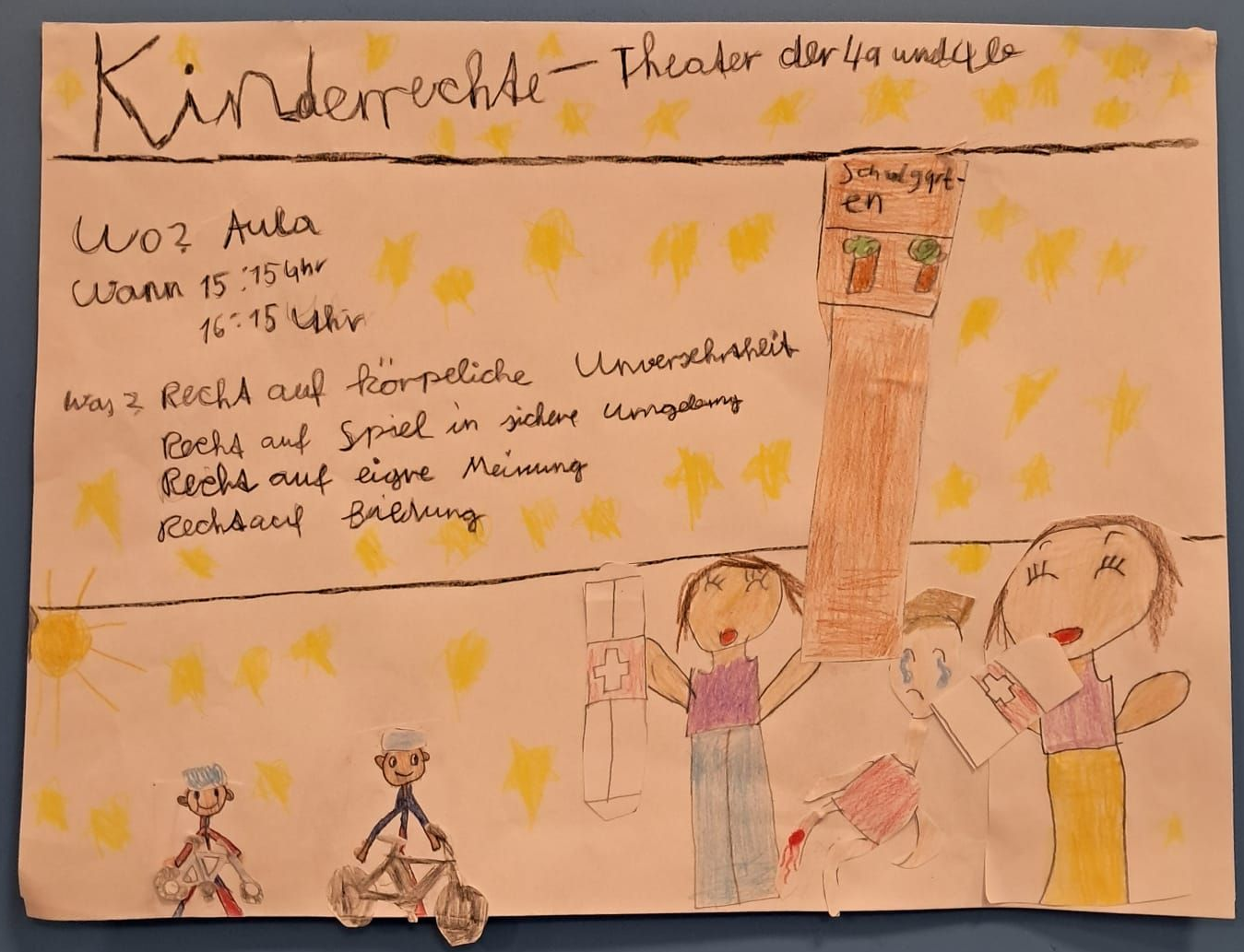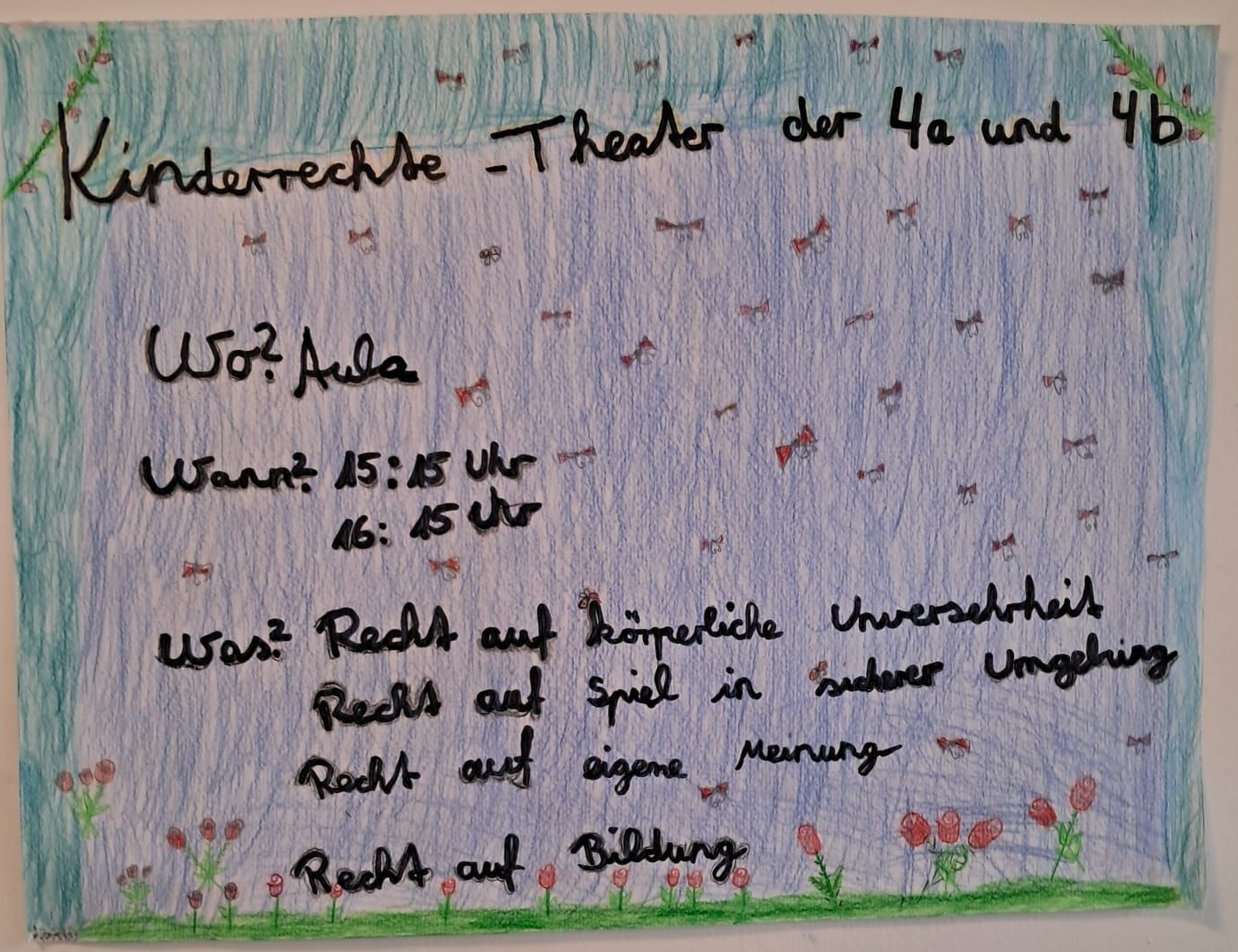 Während ihrer Klassenfahrt setzten sich die vierten Klassen mit den Kinderrechten auseinander. Die Schülerinnen und Schüler entwickelten eigene kleine Theaterszenen, in denen verschiedene Rechte anschaulich dargestellt wurden. Beim Herbstfest präsentierten sie ihre Sketche vor Publikum – die Vorstellungen waren sehr gut besucht und fanden großen Anklang.